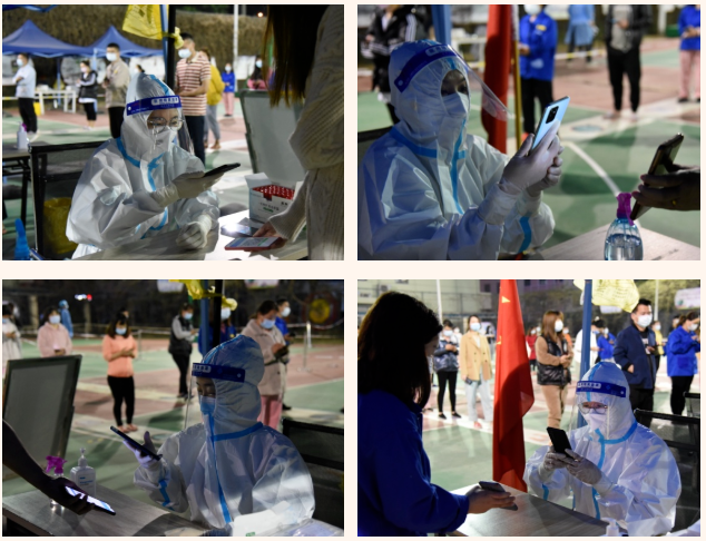核酸采樣登記是核酸檢測(cè)工作中的重要一環(huán)。采樣登記處的“大白”根據(jù)采樣要求,以10人混檢為單位一一完成掃碼登記,仔細(xì)核對(duì)檢測(cè)人員信息。在封控的宿舍內(nèi),“大白”身披改裝挎包,一邊維持著現(xiàn)場秩序,一邊協(xié)助醫(yī)護(hù)人員掃碼登記,全力當(dāng)好醫(yī)生“好幫手”。