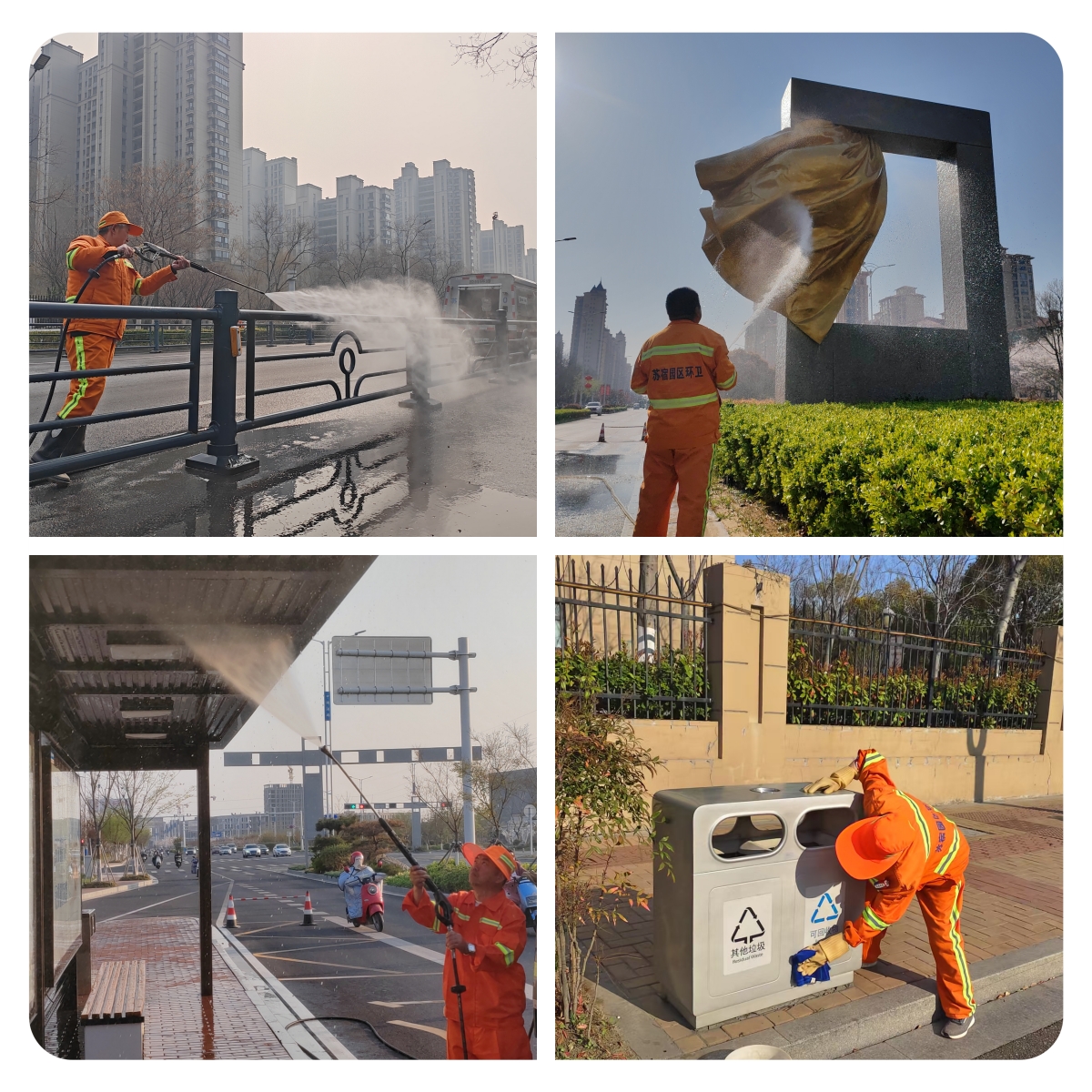 “平面”清洗,“洗”道路本色。采用“洗、沖、刷、掃”組合作業(yè),高壓清洗車、灑水車、洗掃車協(xié)同“作戰(zhàn)”,對園區(qū)主次干道進行了深度清洗,確保道路恢復本色,標線清晰。針對人行道、交叉路口、停車泊位等大中型車輛作業(yè)盲區(qū),使用小型高壓清洗車和人工沖洗進行“補位”作業(yè),確保無盲區(qū)、無死角,實現(xiàn)清潔全覆蓋,讓園區(qū)每一條道路都“煥然一新”。