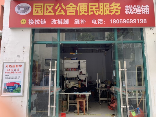 園區(qū)公舍便民服務裁縫鋪位于東吳尚城一層外圍沿街商鋪西首,經營范圍:縫補衣物、修扁褲腳、更換拉鏈等修補衣物業(yè)務。