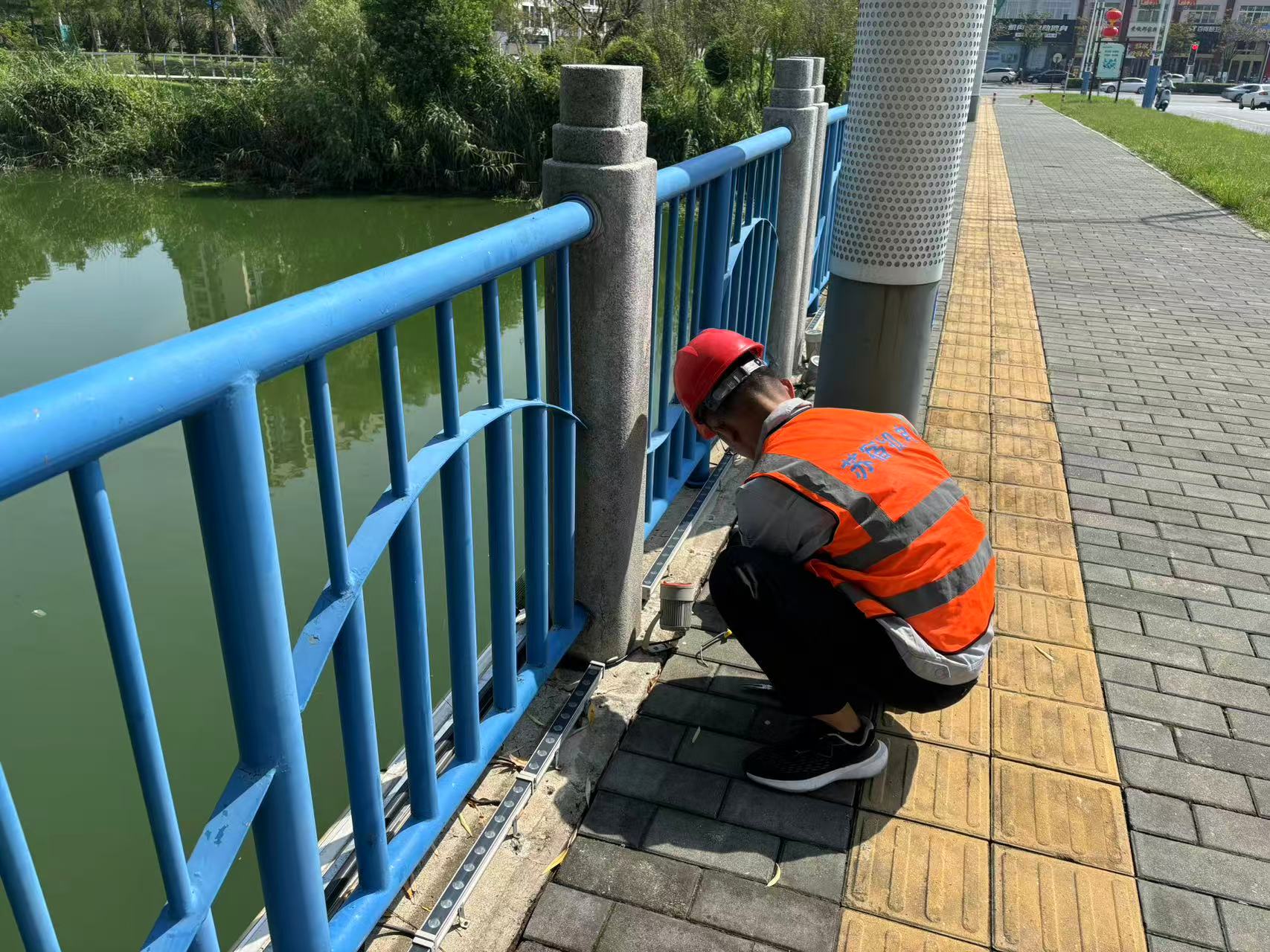 為民河、利民河沿岸、環(huán)形景觀帶及蘇州公園等區(qū)域的景觀燈也是重點排查對象。華燈初上,維護人員按照步巡計劃,沿河逐段細致檢查。他們對RGB全彩洗墻燈、景觀柱燈、抱樹燈等的運行狀態(tài)進行全面檢測:俯身檢查線路外皮是否因高溫開裂,確認沿河燈具安裝牢固程度,并對損壞燈具及時更換。