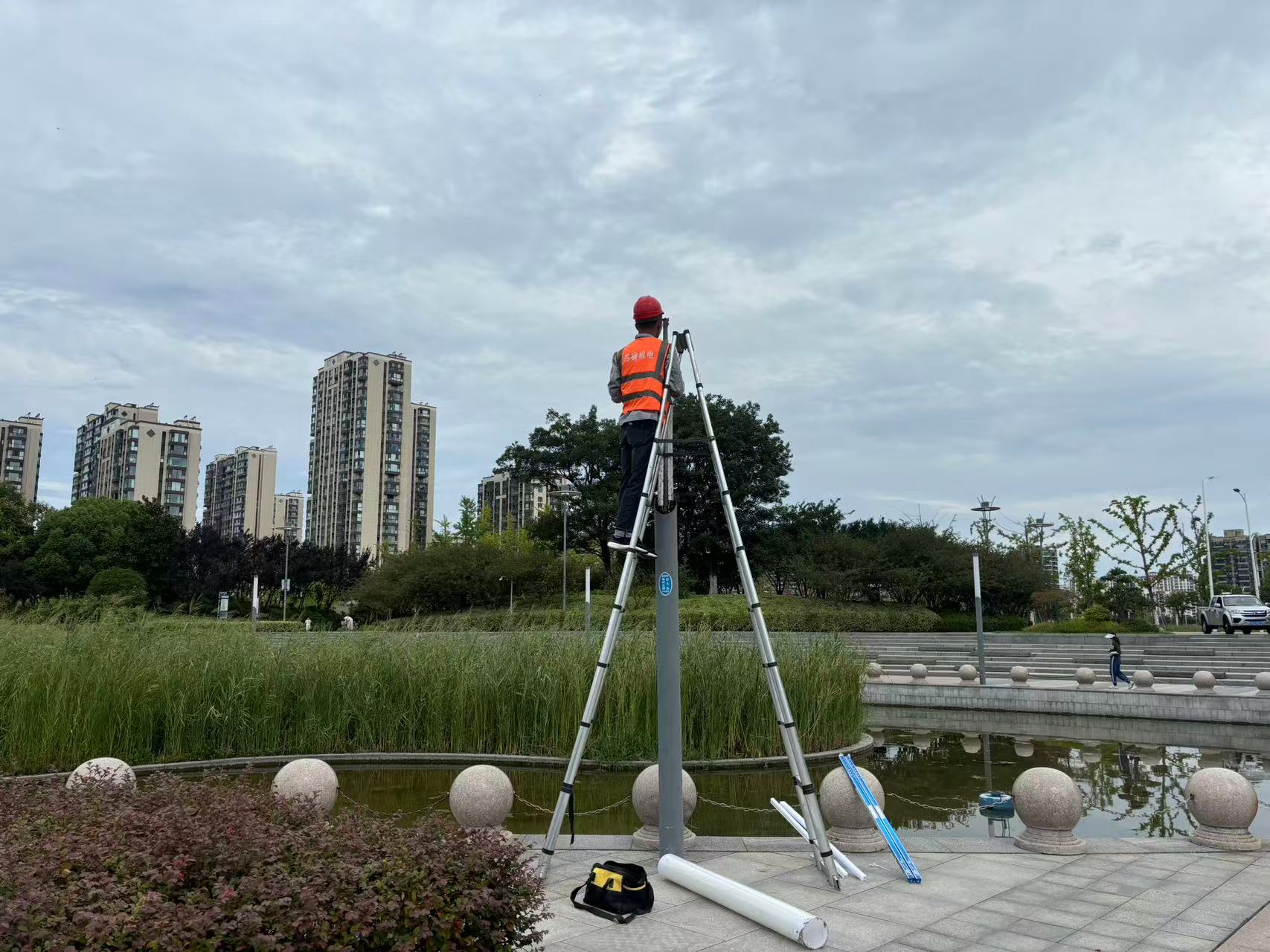 沈剛強介紹:“昨晚巡視發(fā)現(xiàn)蘇州公園大舞臺頂棚部分燈具因高溫損壞,今天一早我們立即組織維修,確保不影響居民晚上鍛煉。”