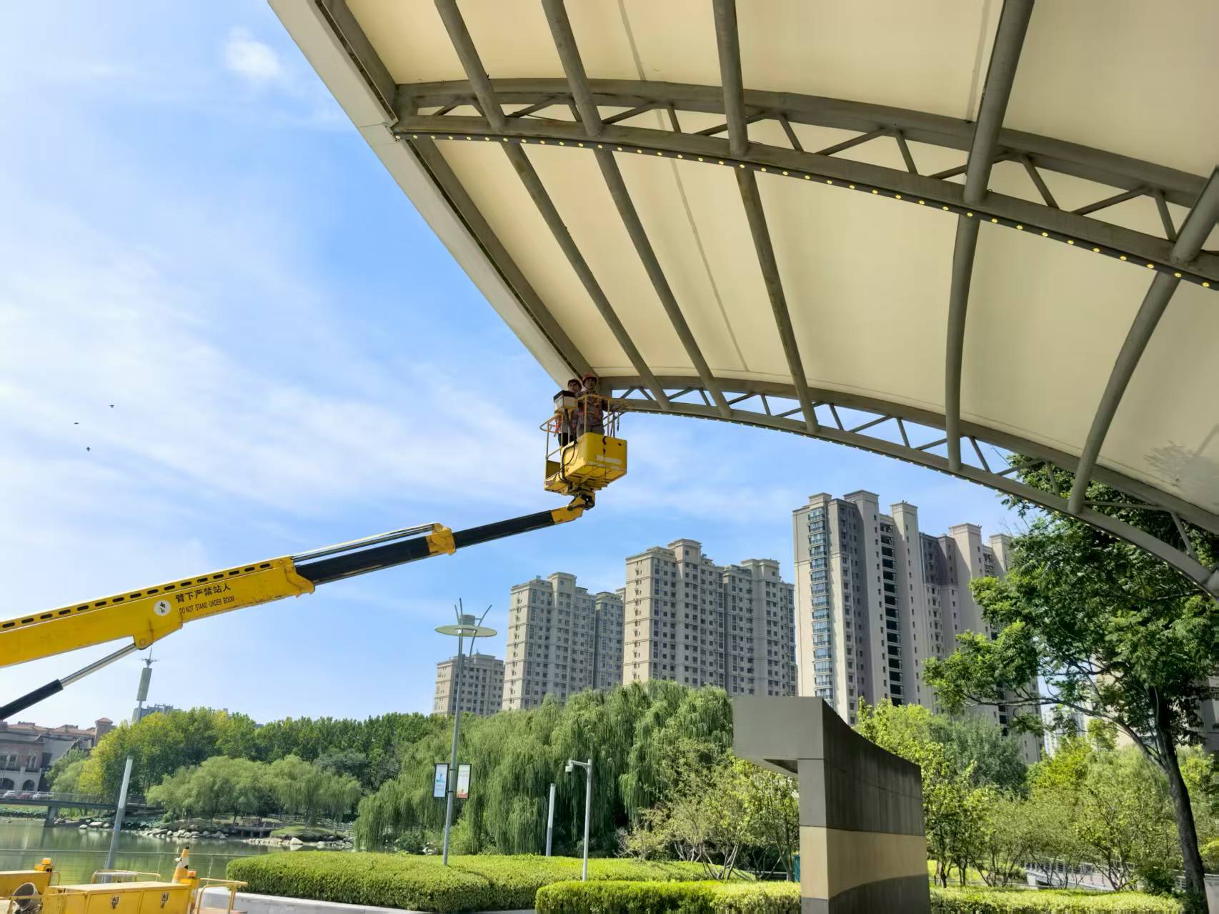 “今天在蘇州公園大舞臺進行登高作業(yè),維修頂部燈光。注意作業(yè)平臺與頂棚保持安全距離……”8月20日上午9點,夏日驕陽似火,蘇州公園作業(yè)現(xiàn)場氣溫已接近37℃。園區(qū)機電維護項目部技術(shù)負責人沈剛強和同事們開始了當天的第一場高空維修。