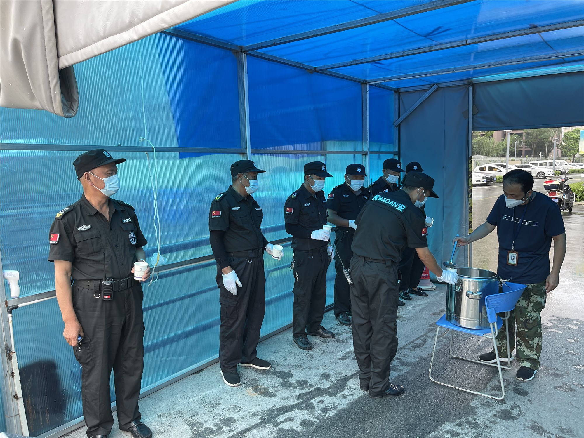 “這是剛熬好的綠豆湯,大家盡快喝?!苯òl(fā)公司為園區(qū)公舍各個(gè)防疫值守點(diǎn)一線人員送去了綠豆湯。