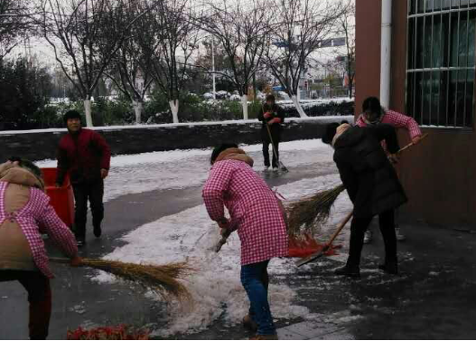 次日氣溫驟降,零下4度,多數(shù)路面存在結(jié)冰現(xiàn)象,加上路面落葉較多。天未亮,保潔、安保人員就到達(dá)園區(qū)公舍主干道、單元門、地庫(kù)出入口等指定區(qū)域,伴隨著凜冽的寒風(fēng),開(kāi)始除雪化冰。對(duì)于他們來(lái)講,這注定又是忙碌的一天,經(jīng)過(guò)2個(gè)小時(shí)緊張而有序的忙碌,基本完成了各個(gè)園區(qū)公舍各個(gè)路面、單元門、非機(jī)動(dòng)車道、地庫(kù)出入口積雪的清掃工作。